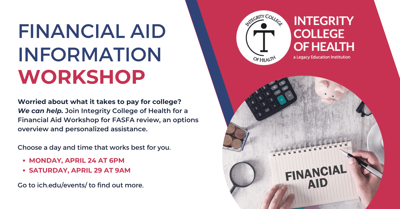 Worried about what it takes to pay for college? We can help. Join Integrity College of Health for a Financial Aid Workshop for FASFA review, an options overview and personalized assistance. Choose a day and time that works best for you.