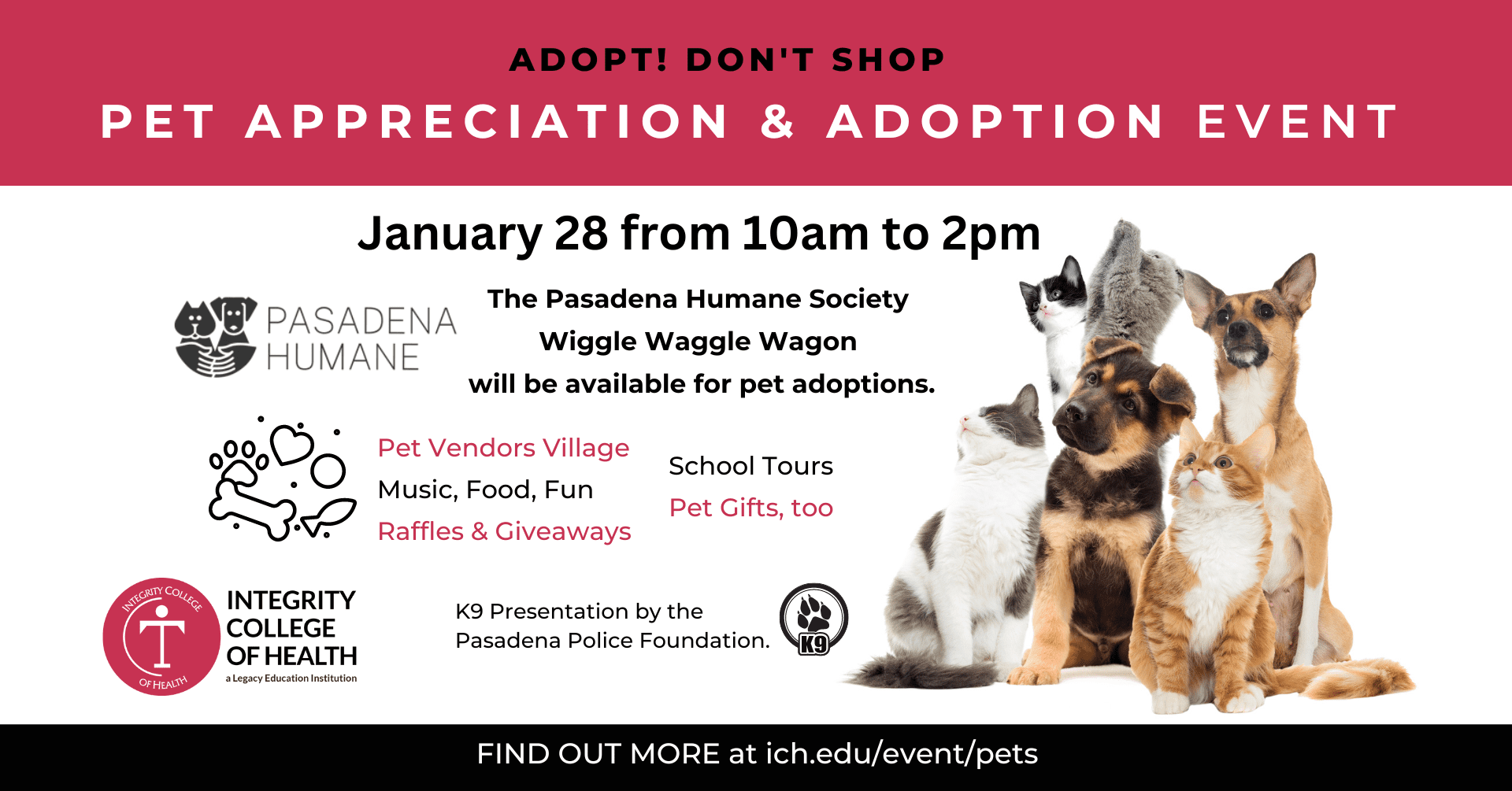 The Pasadena Humane Society Wiggle Waggle Wagon (The Waggin’) will be set up in the lot at Integrity College of Health for a pet adoption event from 10am to 2pm on January 28, 2023.