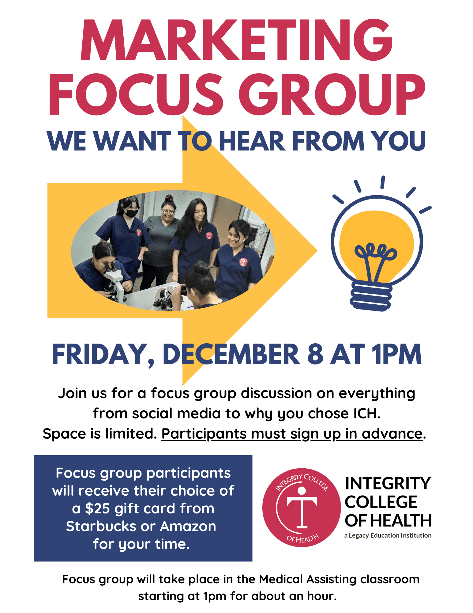 Join us for a focus group discussion on everything from social media to why you chose ICH.